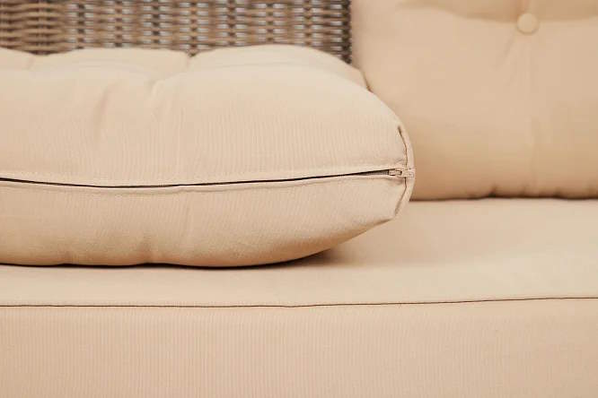 Все мягкие элементы могут быть заменены в случае необходимости. Все подушки облачены в съемные чехлы из 100% полиэстера бежевого цвета. Материал чехлов не позволяет подушкам выгореть на солнце, и дает возможность переносить самые различные нагрузки – от нагрузки на разрыв, до испытаний осадками и перепадами температур.