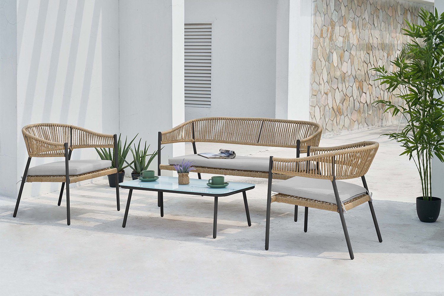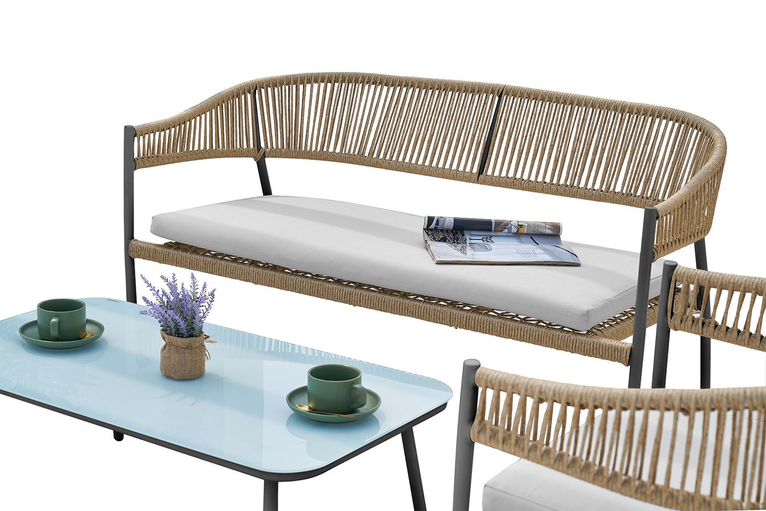 Вся мебель состоит из стального корпуса, оплетенного искусственным ротангом бежевого цвета. На столе к тому же присутствует закалённое стекло - оно просто крепится к ножкам, и так получается прозрачная минималистичная столешница.