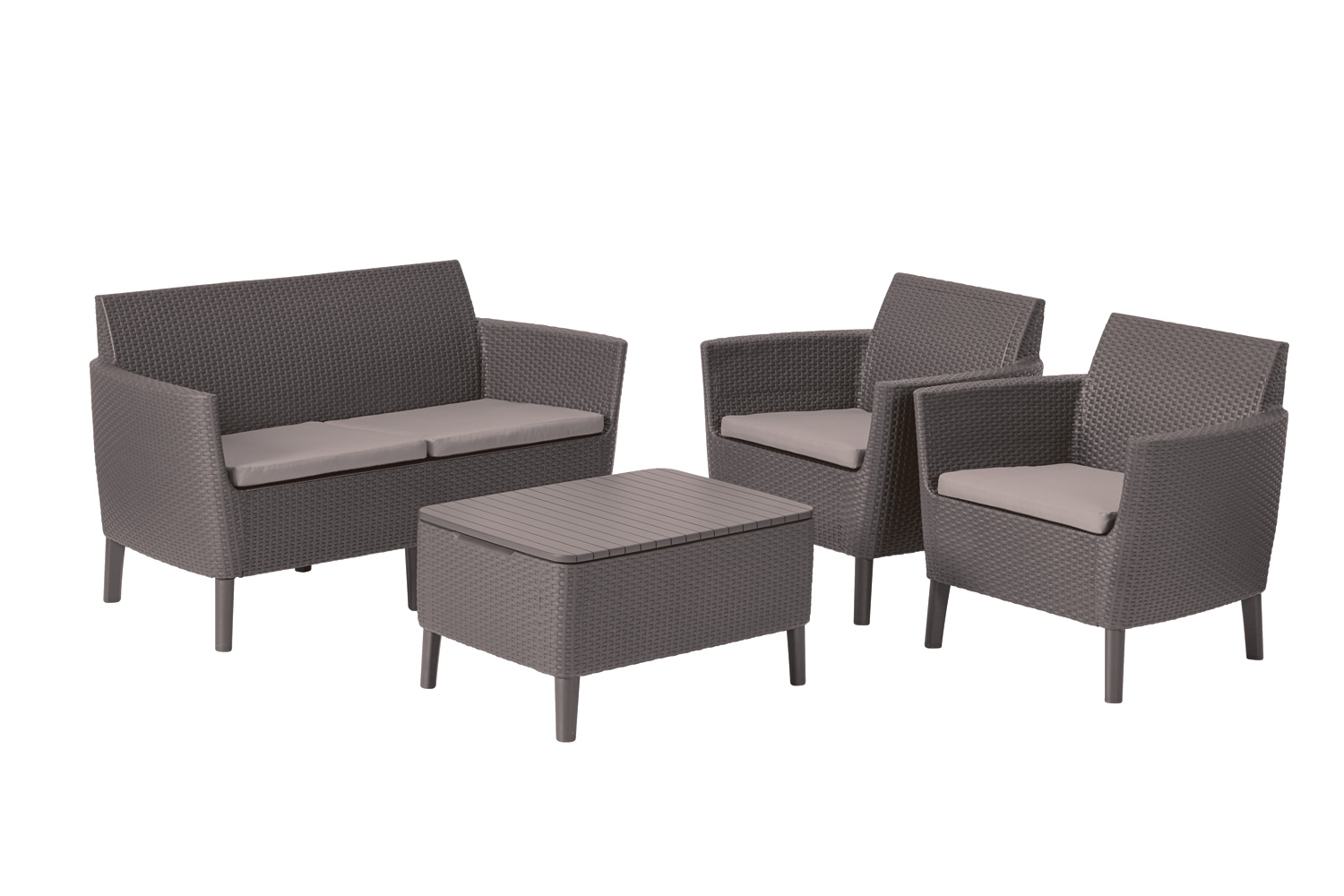 Комплект Salemo Set предназначен для отдыха на природе небольшой компании. Комплект мебели состоит из трехместного дивана 137х76х67, двух кресел 66,5x76x75 см и журнального столика 76х42х57 см. Комплект мебели включает в себя диван на трех человек, двух одноместных кресел и столика с встроенным отсеком для хранения предметов. Все части мебели выполнены в едином стиле – коричневый оттенок (капучино) оплётки, подушек и каркаса.