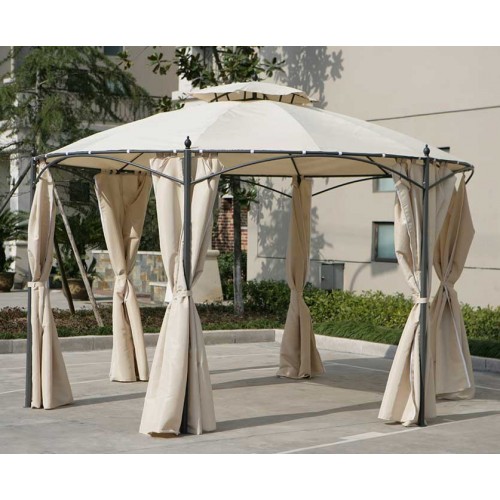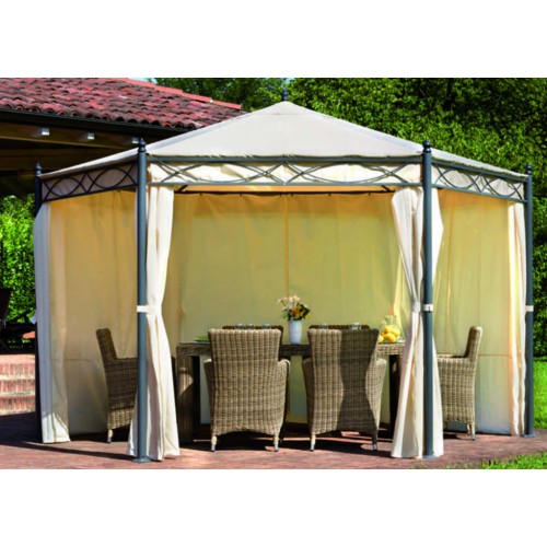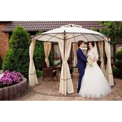 Плотные шторы для шестиугольной беседки представлены в бежевом цвете, который хорошо отражает солнечные лучи. Благодаря легкости ткани даже при закрытых полотнах внутри конструкции поддерживается оптимальная циркуляция воздуха.