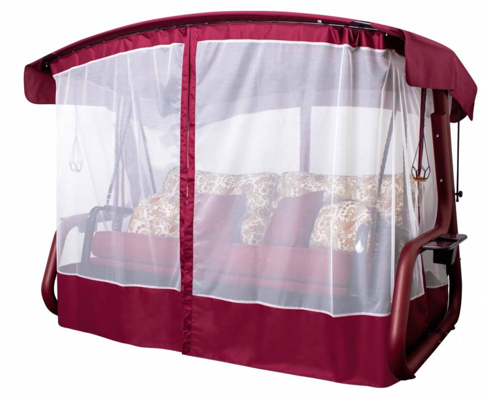 Мы предлагаем вам купить комплект для садовых качелей Эгоист четырехместных. Данный комплект выполнен в бордовом цвете, в него входит тент-крыша, а также москитная сетка. Тент изготовлен из материала оксфорд 600, у антимоскитной сетки также есть вставки на нижней части из данного материала. Подойдёт комплект для глубины садовых качелей 294 см, ширины 170 см, высоты 190 см.
